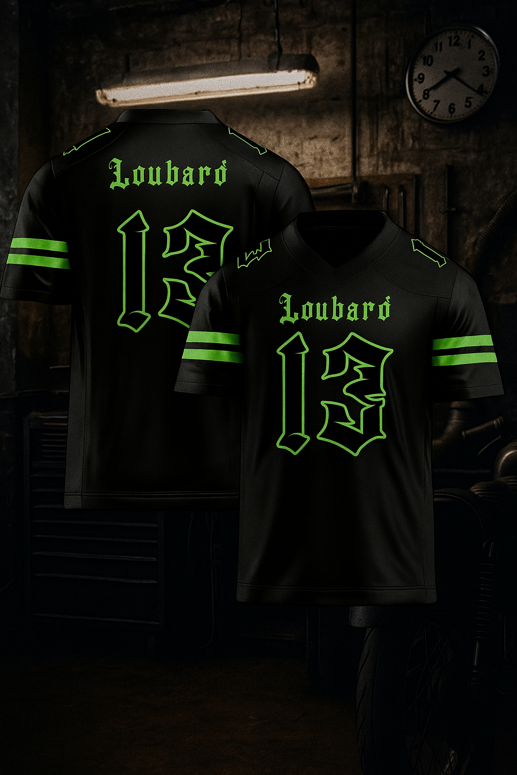 Son design percutant, avec le lettrage Old English “Loubard” et le numéro 13 emblématique, évoque l’univers des clubs de motards, des lowriders et du style chicano californien. Les bandes vertes sur les manches apportent une touche rétro inspirée du sport vintage américain.